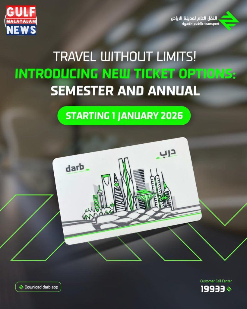 റിയാദ് – 2026 ജനുവരി 1 മുതൽ പുതിയ ടിക്കറ്റുകൾ ആരംഭിക്കുമെന്ന് റിയാദ് പൊതുഗതാഗത അതോറിറ്റി വെള്ളിയാഴ്ച പ്രഖ്യാപിച്ചു.