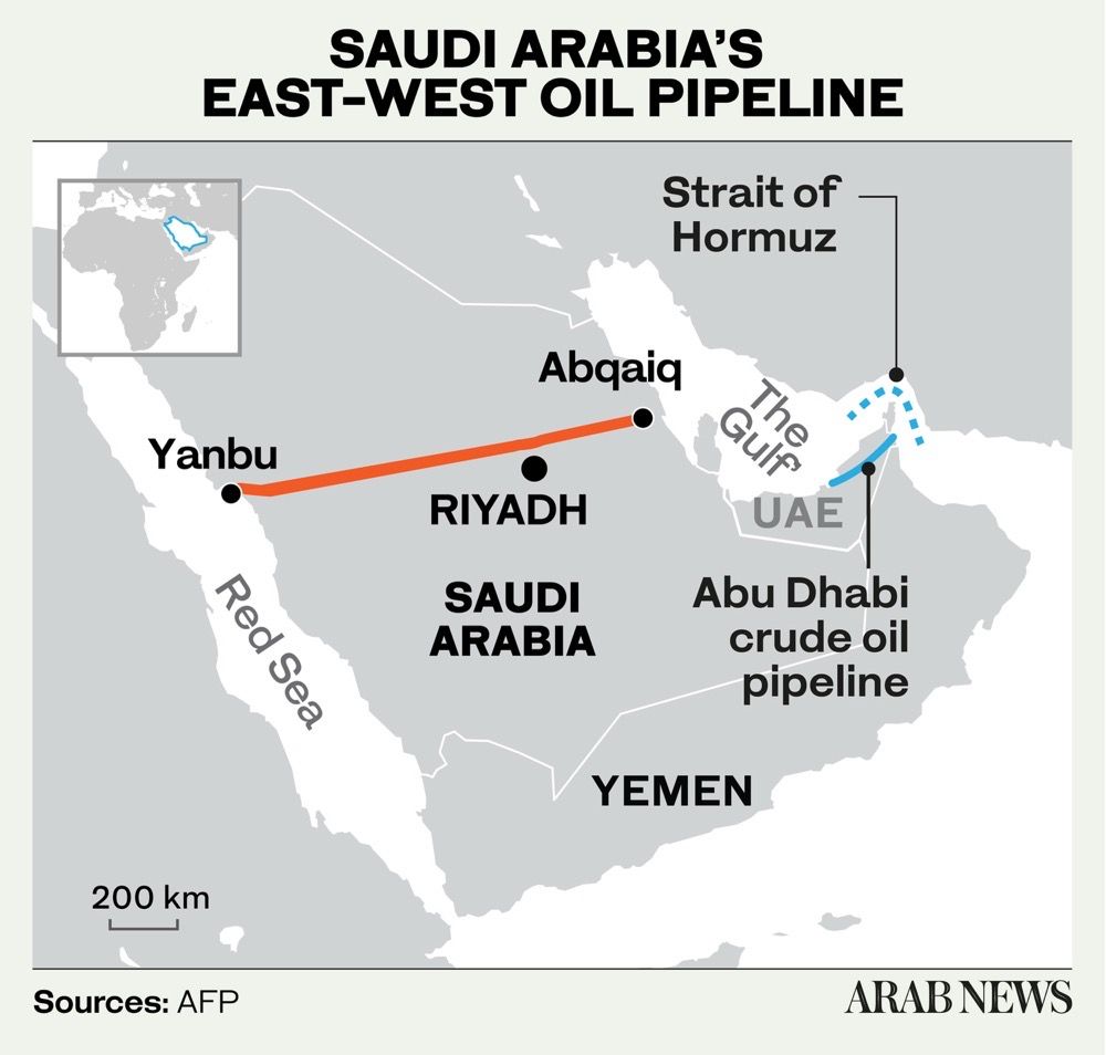 കിഴക്കൻ പ്രവിശ്യയിൽ നിന്ന് യാൻബുവിലേക്ക് ഒരു ദിവസം 7 ദശലക്ഷം ബാരൽ രാജ്യത്തുടനീളം ഒഴുകുന്നത്, ഹോർമുസ് കടലിടുക്കിലൂടെ സാധാരണയായി കടന്നുപോകുന്ന 15 ദശലക്ഷം ബാരലിന്റെ നഷ്ടം ഭാഗികമായി മാത്രമേ നികത്തുന്നുള്ളൂ – ലോകത്തിലെ മൊത്തം ദൈനംദിന ആവശ്യകതയുടെ ഏകദേശം 20 ശതമാനം.