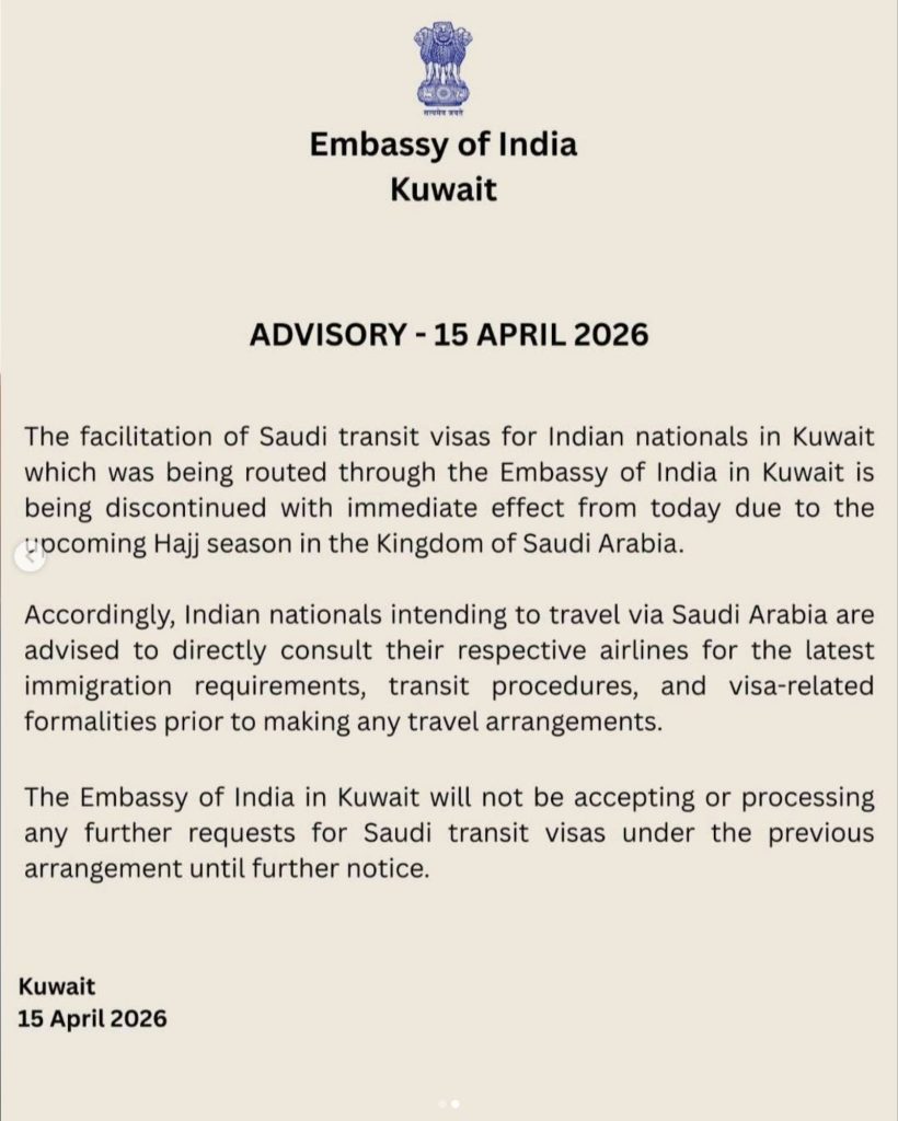 കുവൈത്ത് സിറ്റി:കുവൈത്തിലെ ഇന്ത്യൻ എംബസി വഴി ഇന്ത്യൻ പൗരന്മാർക്ക് നൽകി വന്നിരുന്ന സൗദി ട്രാൻസിറ്റ് വിസാ സേവനങ്ങൾ അടിയന്തരമായി നിർത്തിവെച്ചതായി അധികൃതർ അറിയിച്ചു. ഏപ്രിൽ 15-ന് പുറത്തിറക്കിയ ഔദ്യോഗിക പത്രക്കുറിപ്പിലാണ് എംബസി ഇക്കാര്യം വ്യക്തമാക്കിയത്. സൗദി അറേബ്യയിലെ വരാനിരിക്കുന്ന ഹജ്ജ് സീസൺ കണക്കിലെടുത്താണ് ഈ തീരുമാനം. നിലവിലുള്ള ക്രമീകരണമനുസരിച്ച് സൗദി ട്രാൻസിറ്റ് വിസയ്ക്കുള്ള അപേക്ഷകൾ ഇനി മുതൽ എംബസി സ്വീകരിക്കുകയോ നടപടികൾ പൂർത്തിയാക്കുകയോ ചെയ്യില്ല. ഹജ്ജ് സീസണിലെ തിരക്ക് നിയന്ത്രിക്കുന്നതിൻ്റെ ഭാഗമായി സൗദി ഭരണകൂടം ഏർപ്പെടുത്തിയ നിയന്ത്രണങ്ങളെ തുടർന്നാണിത്.